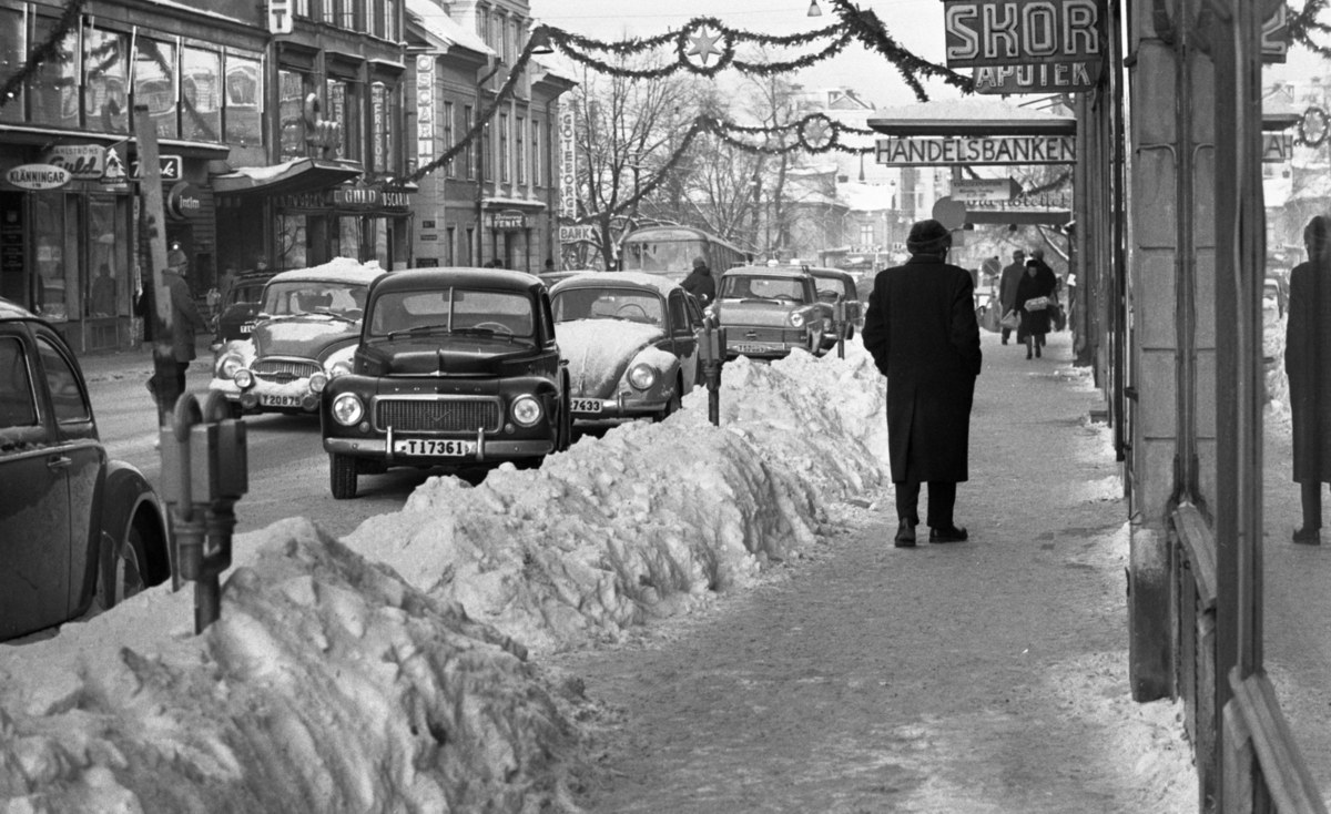 I förgrunden syns en manlig pensionär med ryggen mot kameran. Han går på trottoaren på Drottninggatan. Vid sidan av trottoarkanten finns en snövall. Ur denna sticker parkeringsmätare upp. Bilar står parkerade längs med gatan invid trottoarkanten. Flera människor syns i bakgrunden. Längre fram på gatan hänger en skyltar med texterna "Skor", "Apotek" samt "Handelsbanken." På andra sidan gatan ligger biografen Saga. Över gatan uppe i luften hänger juldekorationer. Bilar och en buss kommer körande på gatan. Det är snö och is på trottoaren.