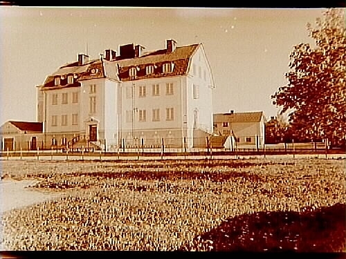 Almby Östra Folkskolan, trevånings skolbyggnad med trapphus, brutet tak och takkuppor.