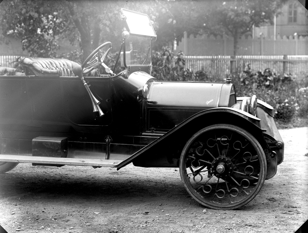 Bilen är en Overland från 1912-14 som blivit modifierad med en typ av fjädrande hjul (förmodligen ett försök att komma förbi däckbristen under första världskriget).