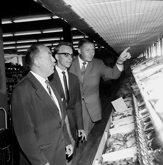 Konsum, affärsinteriör, tre män vid kyldisken.