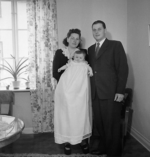 Rumsinteriör, familjegrupp tre personer, barndop.