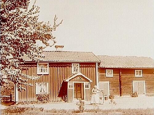 Titel: Tvåvånings bostadshus till höger på bilden. Envånings bostadshus till vänster på bilden. Fem personer framför byggnaderna. Axel Edin