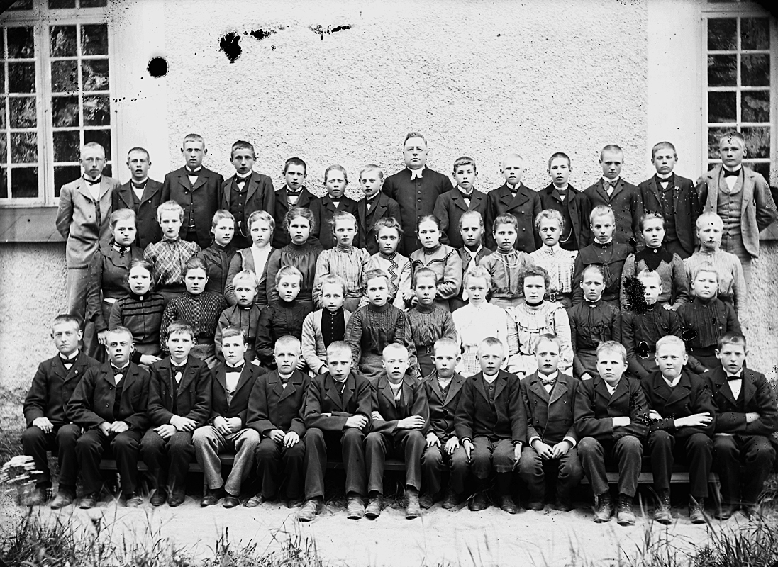 Titel: Konfirmation, konfirmander och en präst. Kyrkobyggnad.