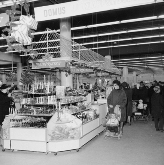 Konsum Domus, affärsinteriör, kunder och personal. Juldisk.