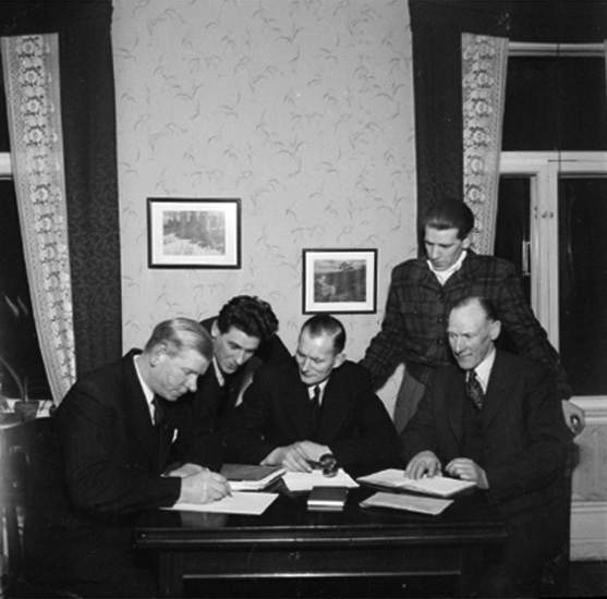 Titel: Rumsinteriör, grupp fem män. Bilreparatörernas styrelse.