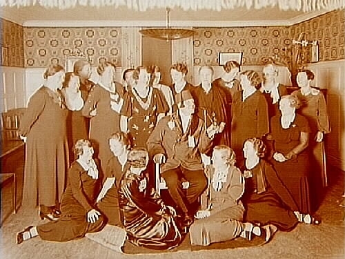 Asklings 50 årskalas, jubileraren och nitton kvinnor på Sörby gård.