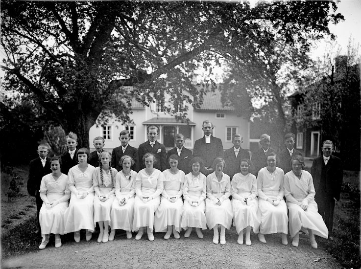 Konfirmander, 11 flickor, 10 pojkar och kyrkoherde Gabriel Carlsten.