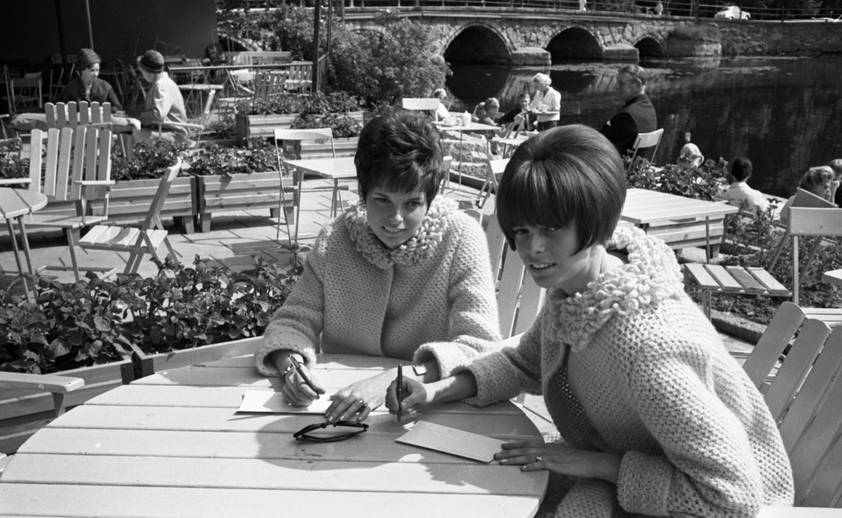 I förgrunden syns två kvinnor vid ett kafébord med vykort och pennor i sina händer. De är iklädda virkade långkoftor samt kortklippta frisyrer. Runtomkring syns ytterligare kafégäster.