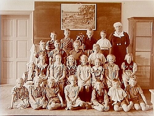 Vasaskolan, klassrumsinteriör, 12 flickor och 11 pojkar med lärarinna fröken Hildur Johansson, klass 2, sal 8.