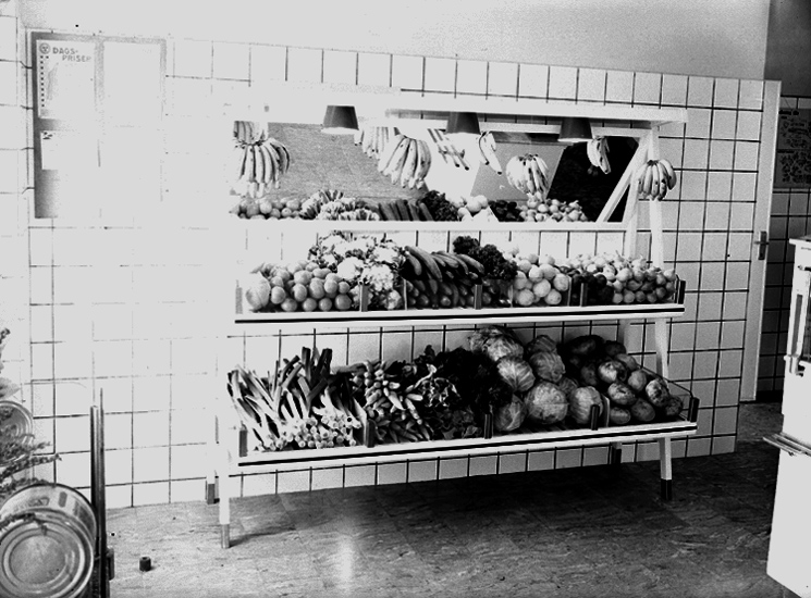 Zanders Köttaffär, affärsinteriör, fruktdisk.