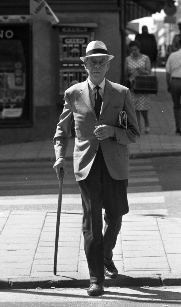 En äldre herre i ljus kavaj, vit skjorta, svart slips, vit hatt med svart band, mörka byxor och mörka skor samt med en käpp i högra handen och en tidning under vänster arm går över en gata i centrala Örebro.
