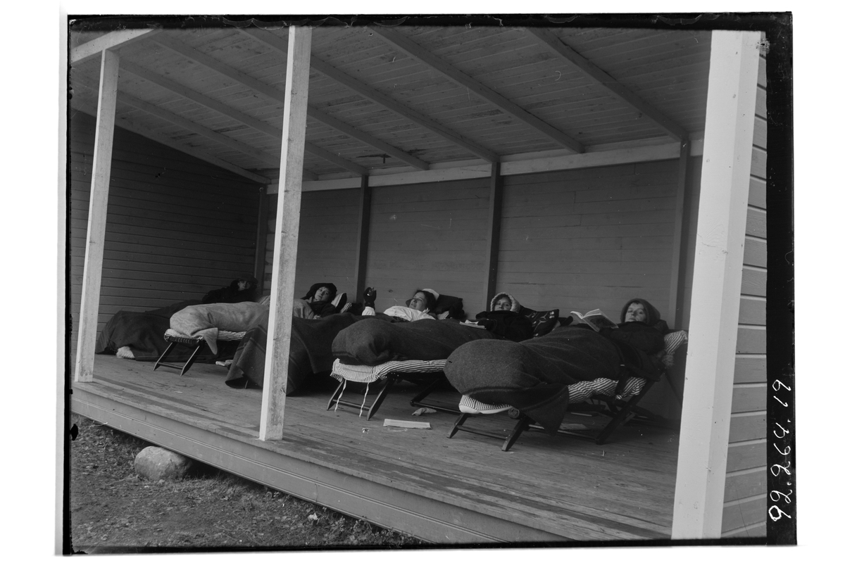 Hålhults sanatorium, exteriör, fyra liggande kvinnor i en skogshall