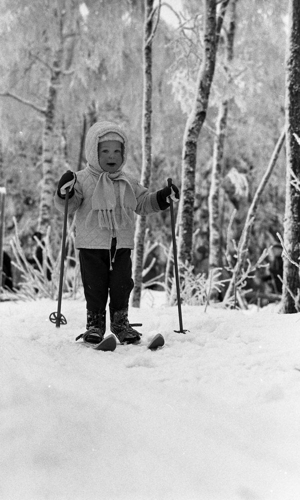 Närbild på ett litet barn som är klädd i vit jacka med luva, vit halsduk, svarta byxor och svartvita vantar. Barnet har skidor på fötterna och stavar i händerna. Det ligger snö på marken.