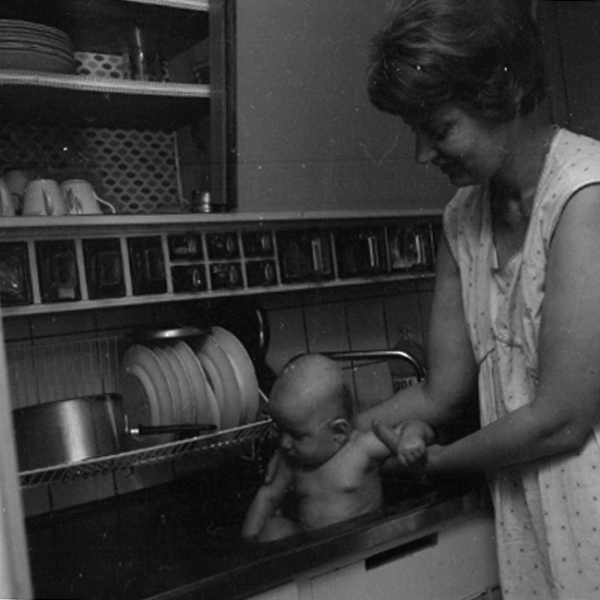 Rumsinteriör, en liten pojke som badar i diskhon, en kvinna.