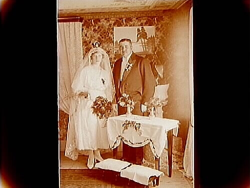 Bröllop, brudpar, bruden helt i vitt, med lång slöja och krona, brudgummen i frack.