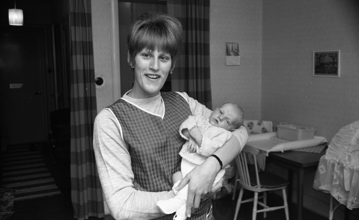 I en lägenhet står en kvinna och håller en baby i famnen.