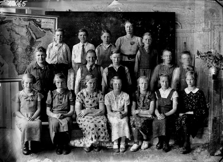 Hagaby skola, klassrumsinteriör, 16 skolbarn med lärarinna fröken Barbro Waldenström.