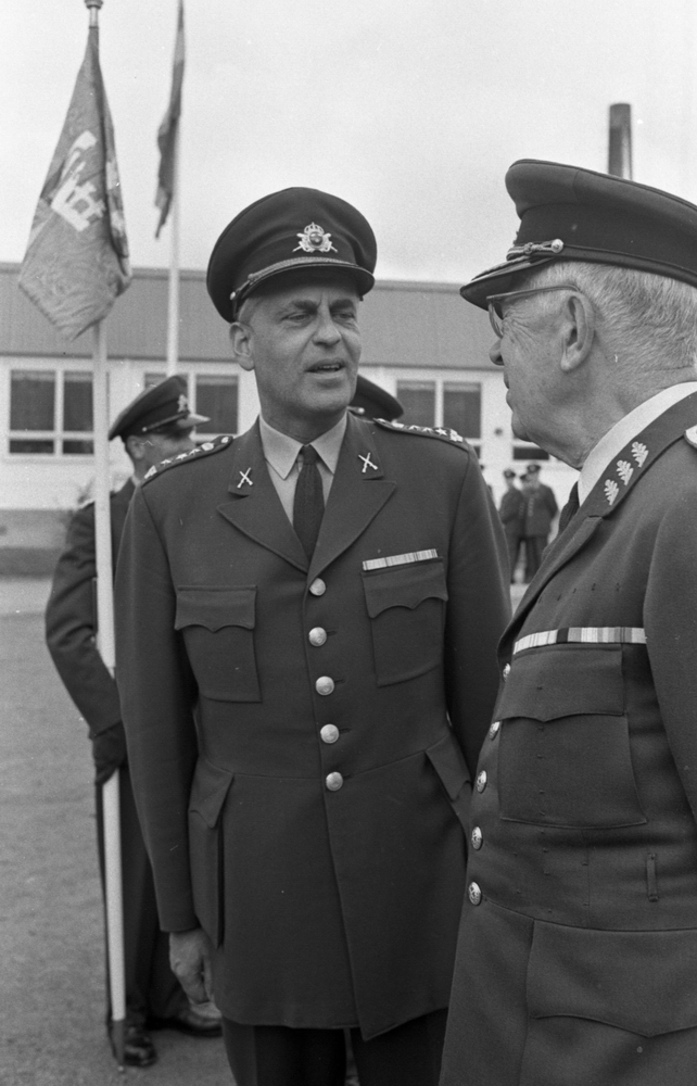 Kung Gustav VI Adolf besöker Örebro Livregementes Grenadjärer i Grenadjärsstaden. Ett antal män står uppställlda på regementsgården klädda i militäruniformer liksom kungen. Den sistnämnde står och samtalar med en general. I bakgrunden står två andra mlitärer varav den ene har en befälsbricka runt halsen samt en håller en fana i handen. Andra personer syns i bakgrunden.