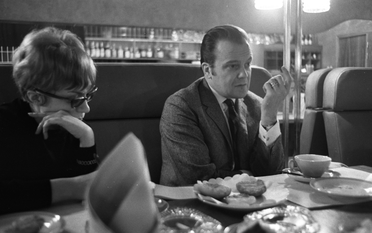 Gunnar Hellström sitter tillsammans med en kvinna vid ett bord inne på en restaurang. Han håller upp sin vänstra hand i luften och har sin vänstra armbåge stödd mot bordet. På bordet står ett fat med skorpor samt två askfat. I bakgrunden skymtar en bardisk med flaskor.
