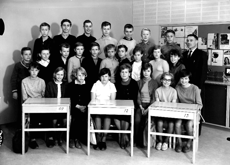 Olaus Petri nya skola, klassrumsinteriör, 25 skolbarn med lärare Eric Fransson.