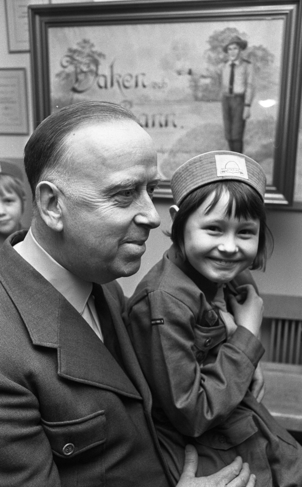 Liten scoutflicka sitter i en äldre mans knä. På hennes hatt står "Solstrålarna." På en tavla i bakgrunden står det "Vaken och sann."