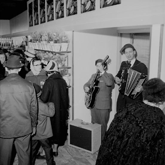 Titel: Konsumhallen i Laxå, affärsinteriör, kunder och personal.