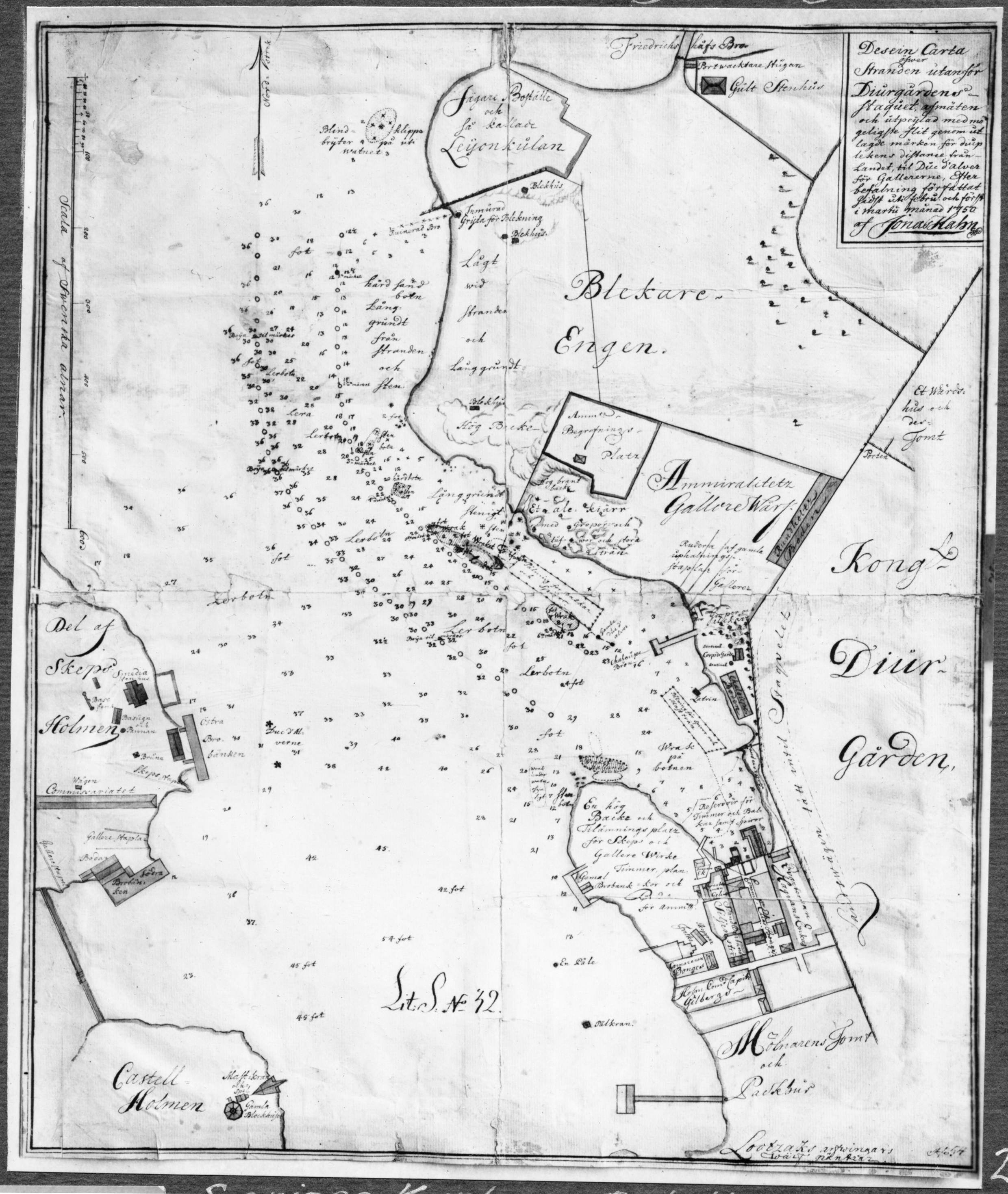 Kyrkogården och dess omgivning, karta, detalj. Foto efter karta av J. Hahn 1750.