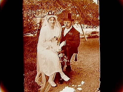 Brudpar, bruden helt i vitt, med myrtenkrona och lång slöja, brudgummen i bonjour och cylinderhatt.