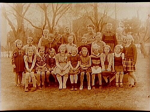 Titel: Almby Norra skola, 11 flickor, 10 pojkar med lärarinna fröken Lisa Hallin, på skolgården. Sal 2, klass 2.