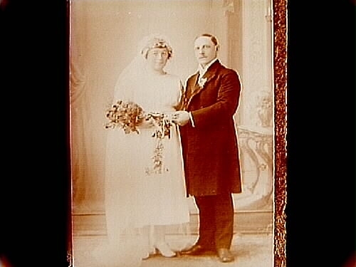 Brudpar, bruden helt i vitt med lång slöja, brudgummen i bonjour.