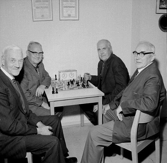 Rumsinteriör, fyra män. "Schack-årsmöte".