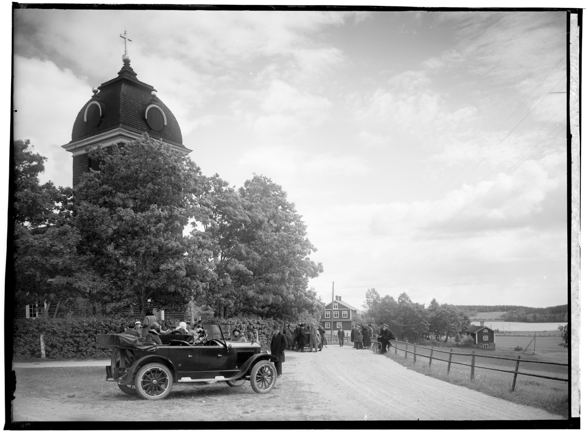 Hjulsjö kyrkan. Två öppna bilar framför kyrkan.