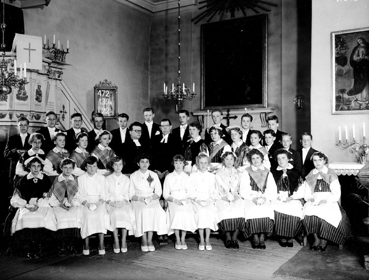 Konfirmander, 19 flickor, 13 pojkar, pastor Erik Linden och prosten Gabriel Carlsten.