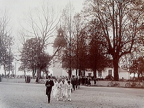 Ekeby kyrka, konfirmander, kyrkoherde Gabriel Carlsten med konfirmander kommer från kyrkan.