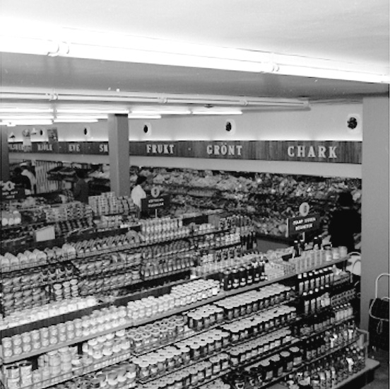 Konsum, affärsinteriör, kunder och personal.