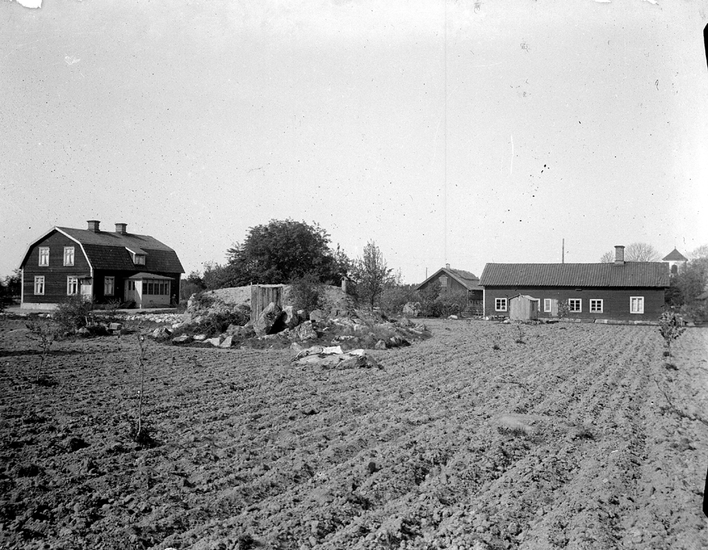 "Morfars gård "Karlshem" som han byggde efter flytten från Fullerö "Fiskars" omkring 1910. Ladugården till höger om längan med bagarstuga och drängstuga brann 1918 på grund av lek med eld. Jag var med och min bror Olle (6 år) hade fått tag i tändstickor och skulle göra en brasa i halmhögen vid bortre gaveln. Senare byggdes en då modern ladugård på en annan plats på gården. Branden var mitt i sommaren. Bilden här är antagligen tagen strax innan dess, kanske på våren 1918. Potatisen är satt.