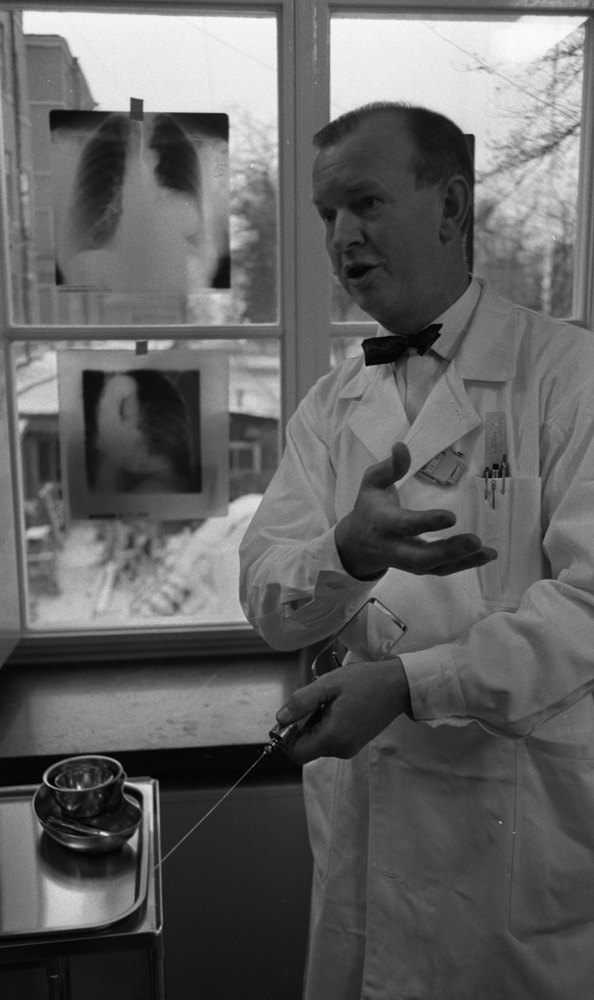 En läkare i vit rock står och håller i en spruta med sin vänstra hand. Bakom honom finns tre röntgenbilder som är uppsatta på fönstret. Han befinner sig i ett rum på Regionsjukhuset i Örebro.