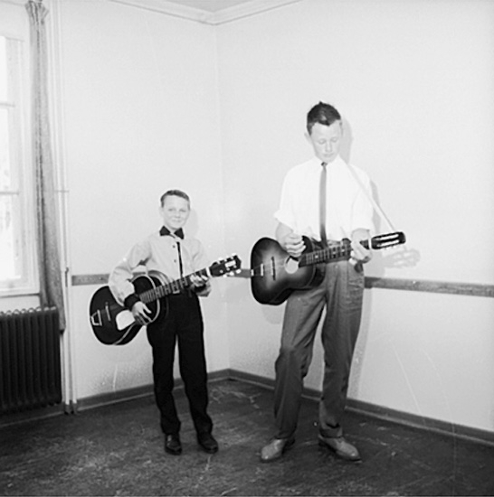 Bångbro skola, examen i slöjden, två pojkar med musikinstrument.