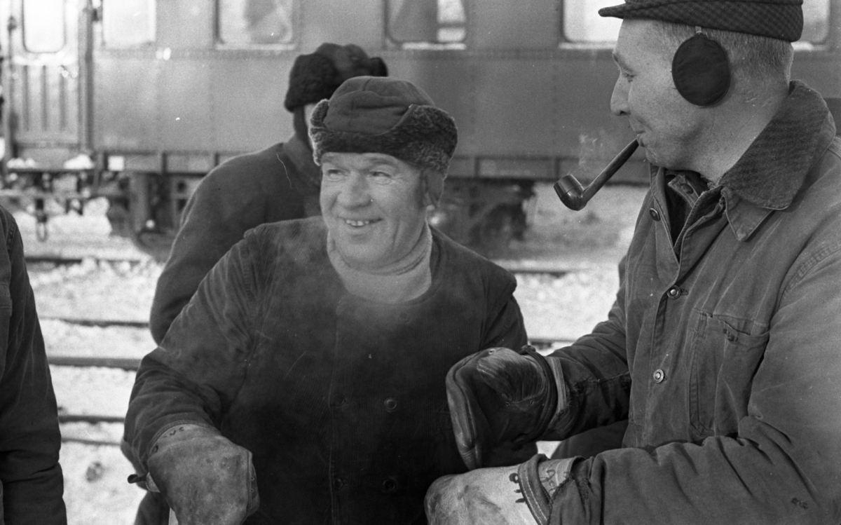 Titel: Hallsbergsskottarna 5 januari 1966 Närbild på män i arbetskläder som skottar bort snö från järnvägsräls