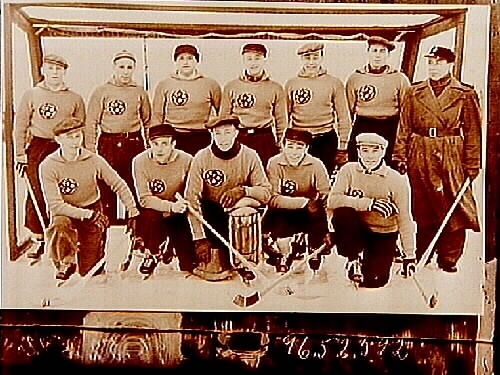 ÖSK Bandylag 1942. Lagledare Helge Jensen, Bengt Hogeby, Jörgen Wasberg, Börje Johansson, Ecke Östling, Rune Stenberg, 'Klämmen' Pettersson. Nedre raden: Lars Åkerström, Erik Svensson, Gösta Klingberg, Karl Flink och Sven Eklund.