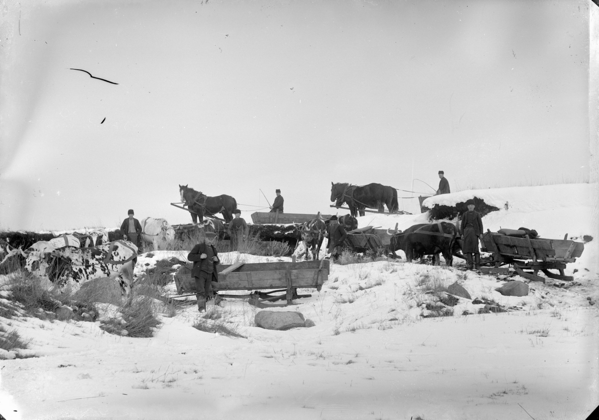 Två par hästar, fyra par oxar i arbetet med slädar.