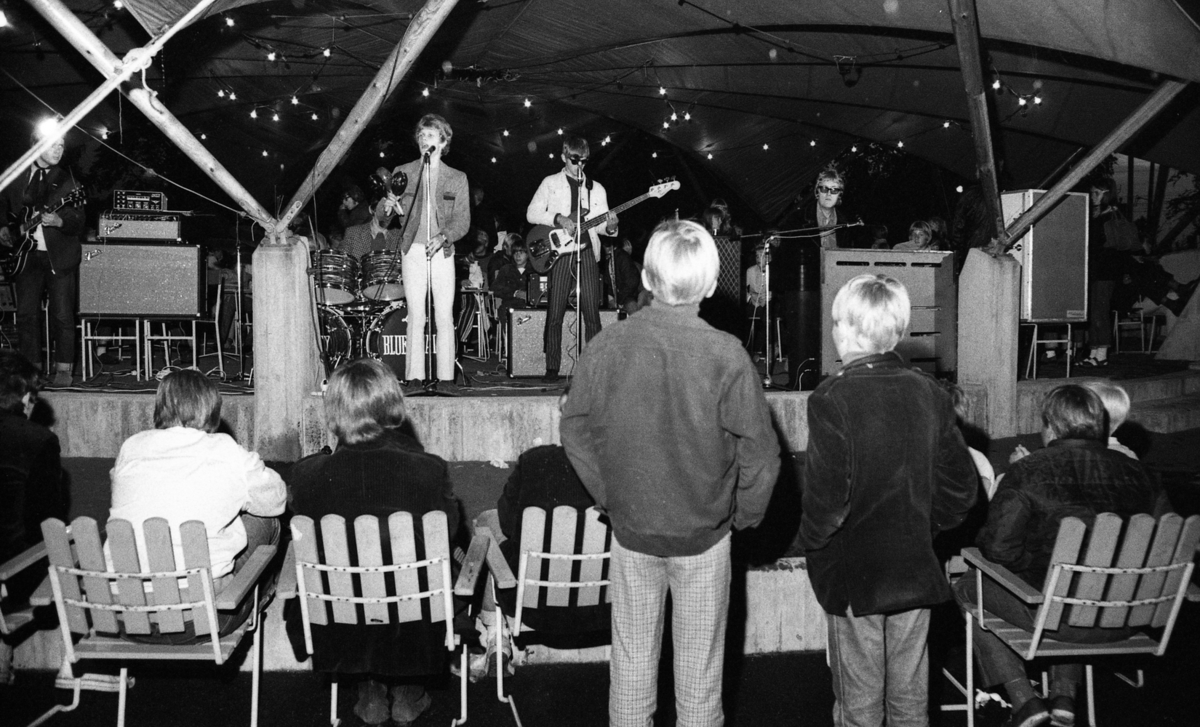 En musikgrupp bestående av unga människor spelar inför en tonårspublik på en utomhusscen på Gustavsvik. De sjunger och spelar gitarr, maracas, trummor och piano.