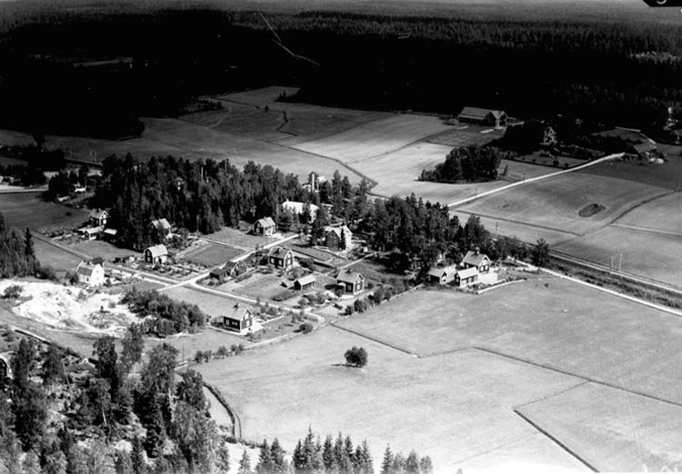 Titel: Flygfoto över Dylta Bruk, bostadshus och byggnader.