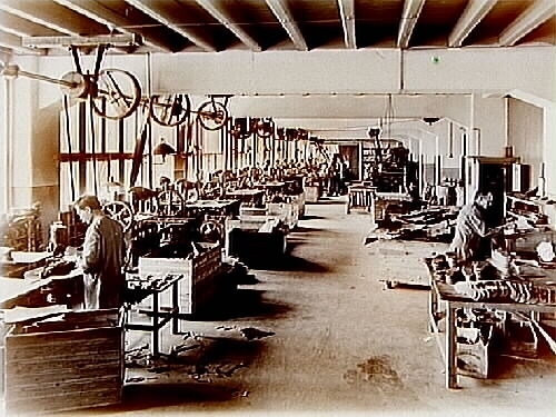 Titel: Skofabriken Engelbrekt, interiör från stansavdelningen, första våningen. AB J. Pehrson & Comp.