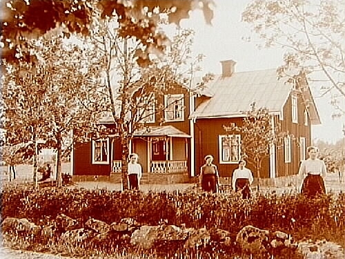 En och en halvvånings bostadshus med veranda, 4 kvinnor framför byggnaden.