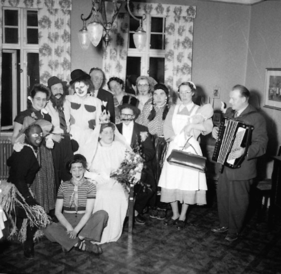 Rumsinteriör, grupp 13 utklädda personer, möhippa.