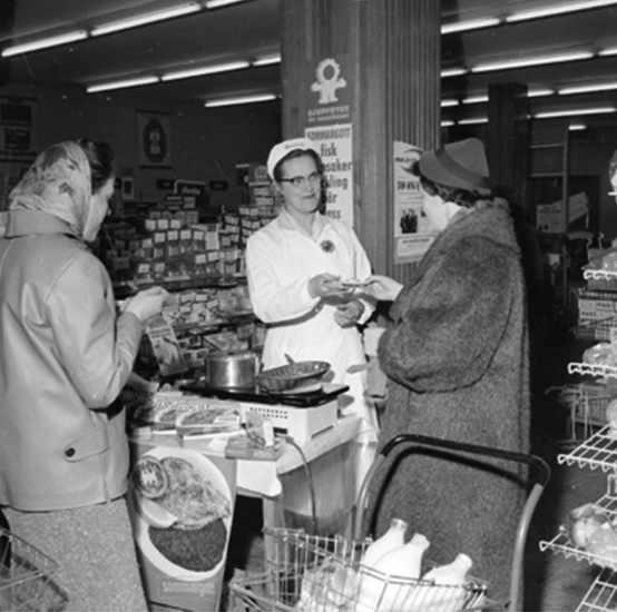 Konsum snabbköp, affärsinteriör, kunder och personal, demonstration av djupfryst mat.