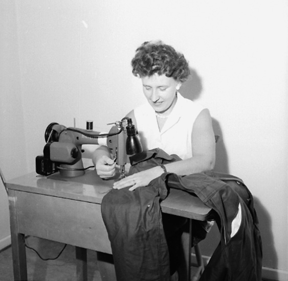 Interiör, en kvinna vid symaskinen.