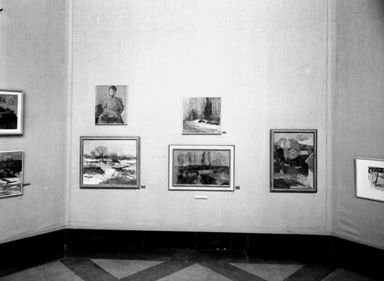 Titel: Inga Bergs utställning på Konserthuset, interiör av utställningssalen, tavlor.