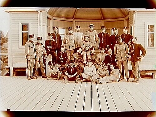 23 soldater framför estraden av dansbanan i Folkets Park, Rynningegatan.